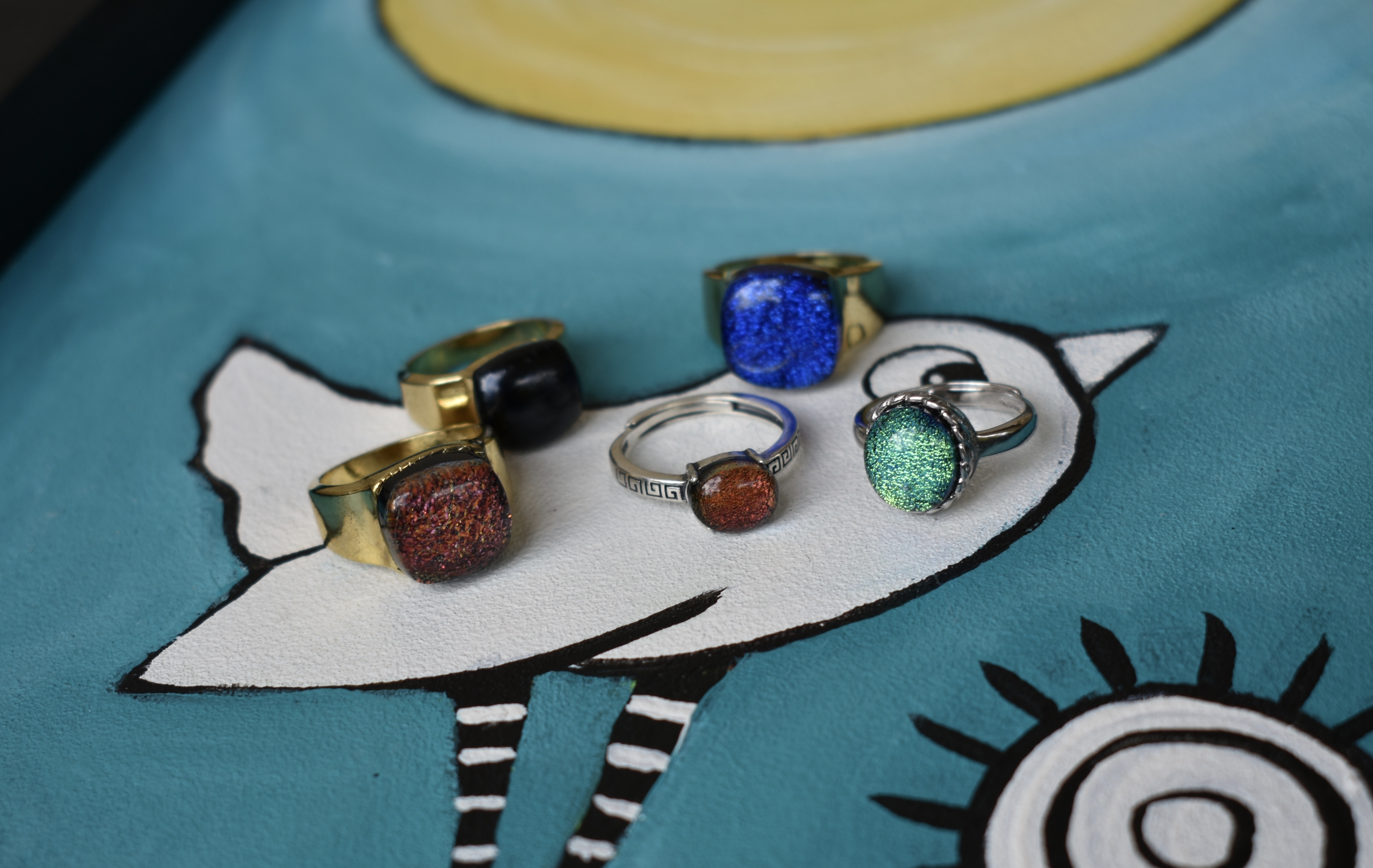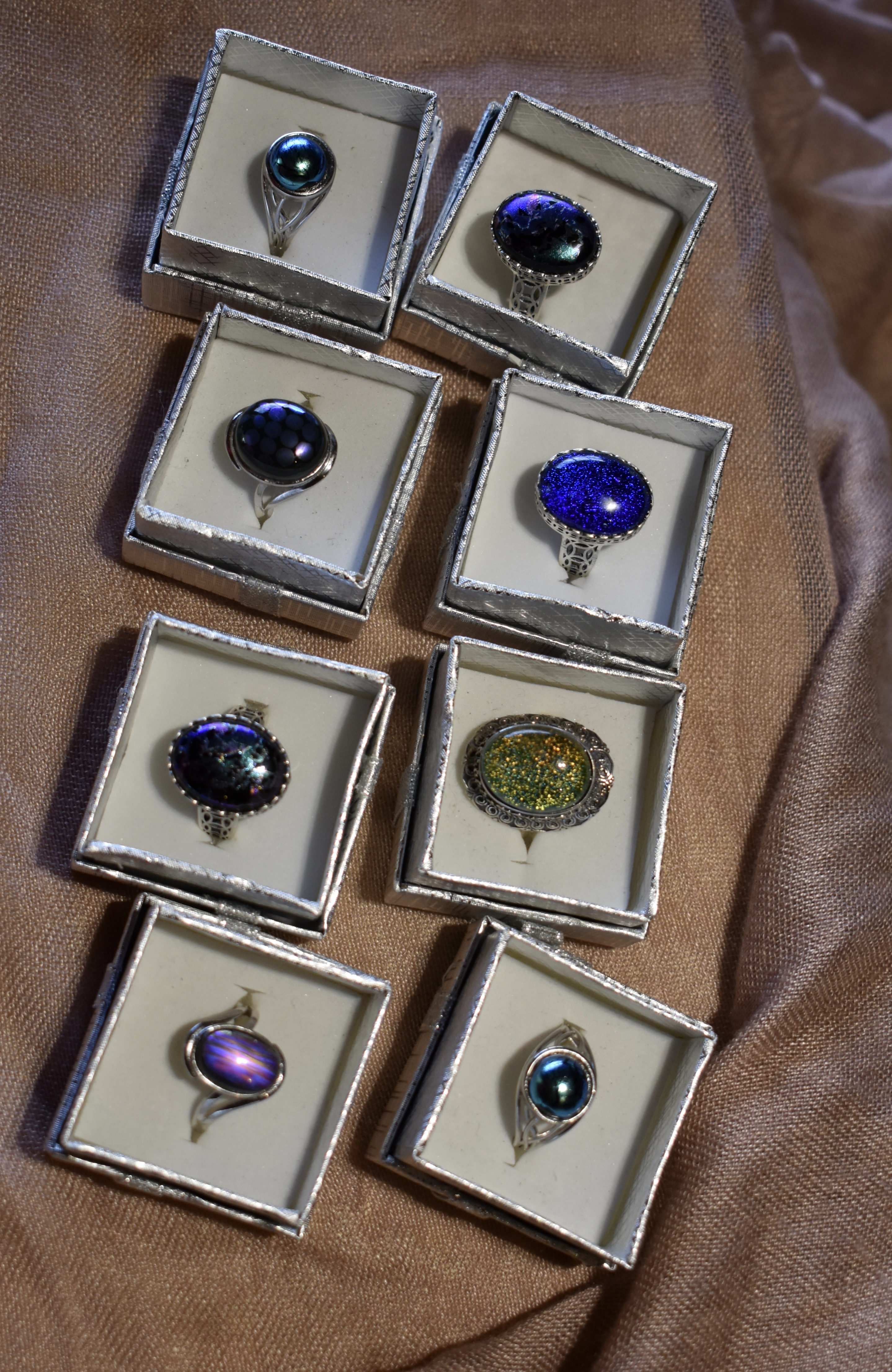 Creating affordable, quality rings has been my aim over the past month or so. Glass Galaxy is primarily about making glass pendants, but a selection of good quality rings and earrings is equally important. These have been made with 925 Silver settings and dichroic glass. I hope you enjoy the new designs up on the website and there are more to see at markets I attend.
